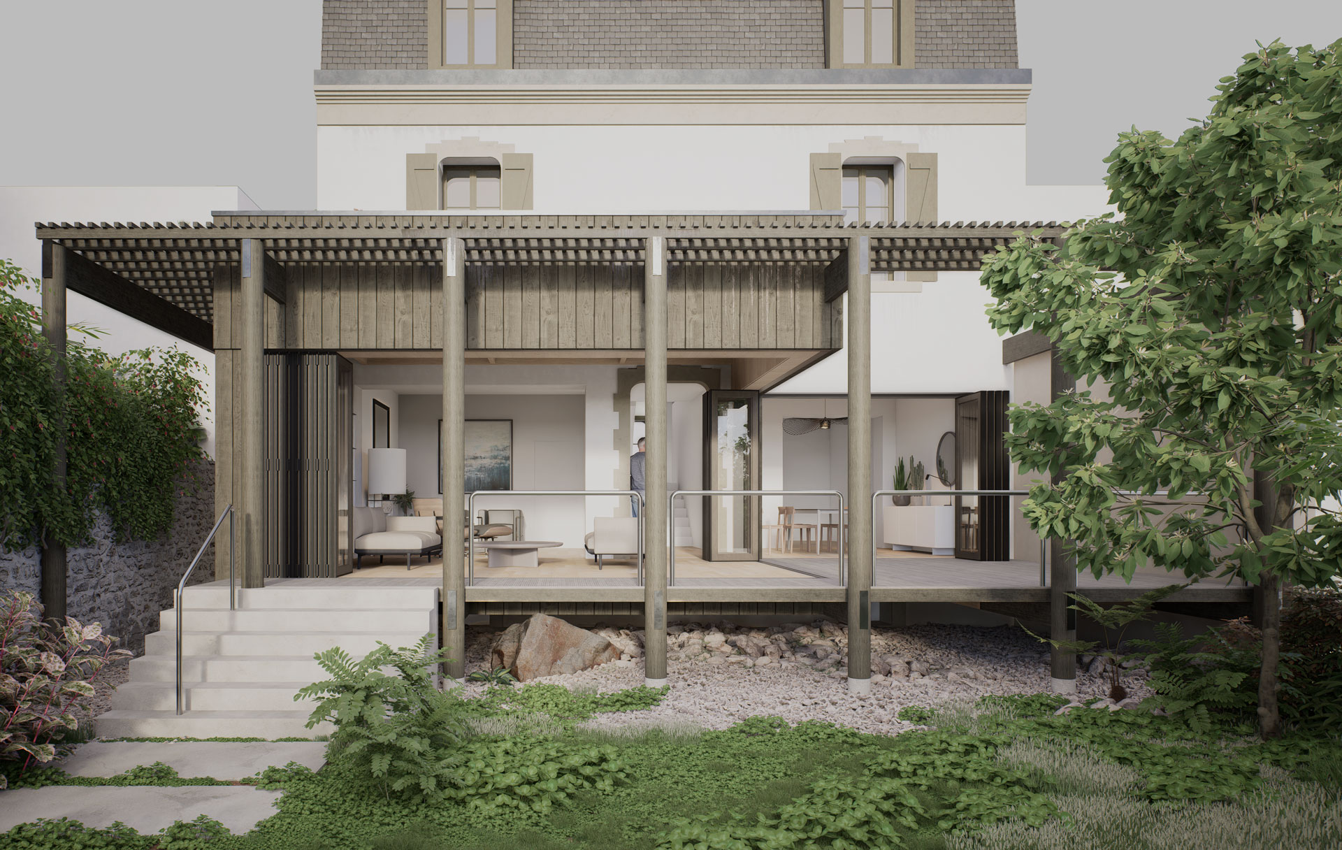 Réhabilitation et extension d’une maison de ville à Vannes, alliant restauration soignée des façades et menuiseries, amélioration du confort thermique, et création d’un agrandissement sur le jardin.