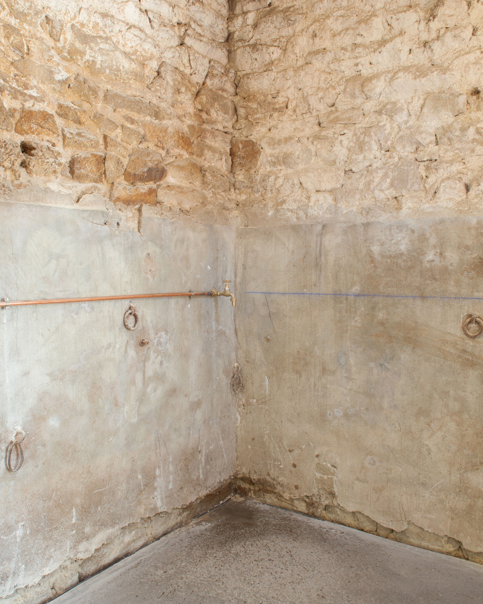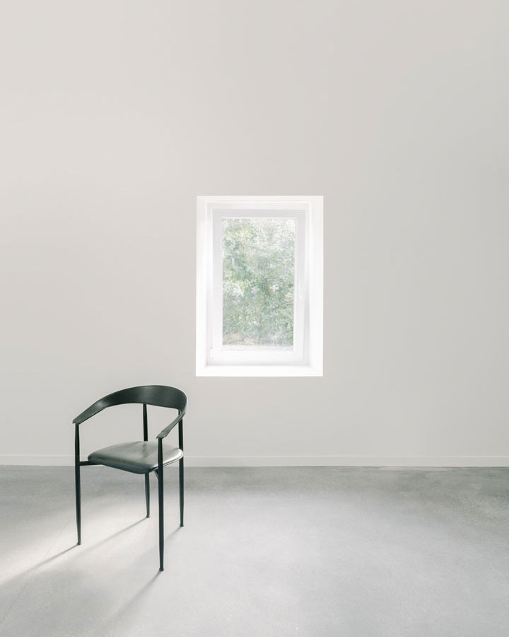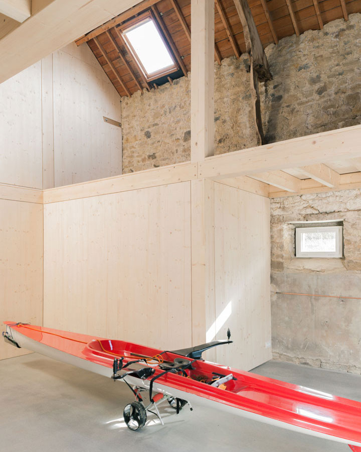 Le bâtiment a d’abord été entièrement curé pour ne garder que les éléments sains de l’enveloppe. L’isolation, les menuiseries et l’ensemble des réseaux ont été repris. Le projet s’est dessiné ensuite autour des apports de lumière existants pour ne pas créer d’ouvertures structurelles dans les façades. Le séjour joue donc de sa double hauteur pour récupérer la lumière en partie haute. Le mur de refend, décoré de sa cheminée en pierre, retrouve toute sa splendeur et se dresse tel un fond de scène sur l’espace de vie. Une dalle en béton armé est coulée sur isolant, puis polie, en mémoire du sol de l’ancienne étable. Cette surface continue assure le lien entre tous les espaces et apporte avec son inertie un confort thermique au ressenti ambiant.