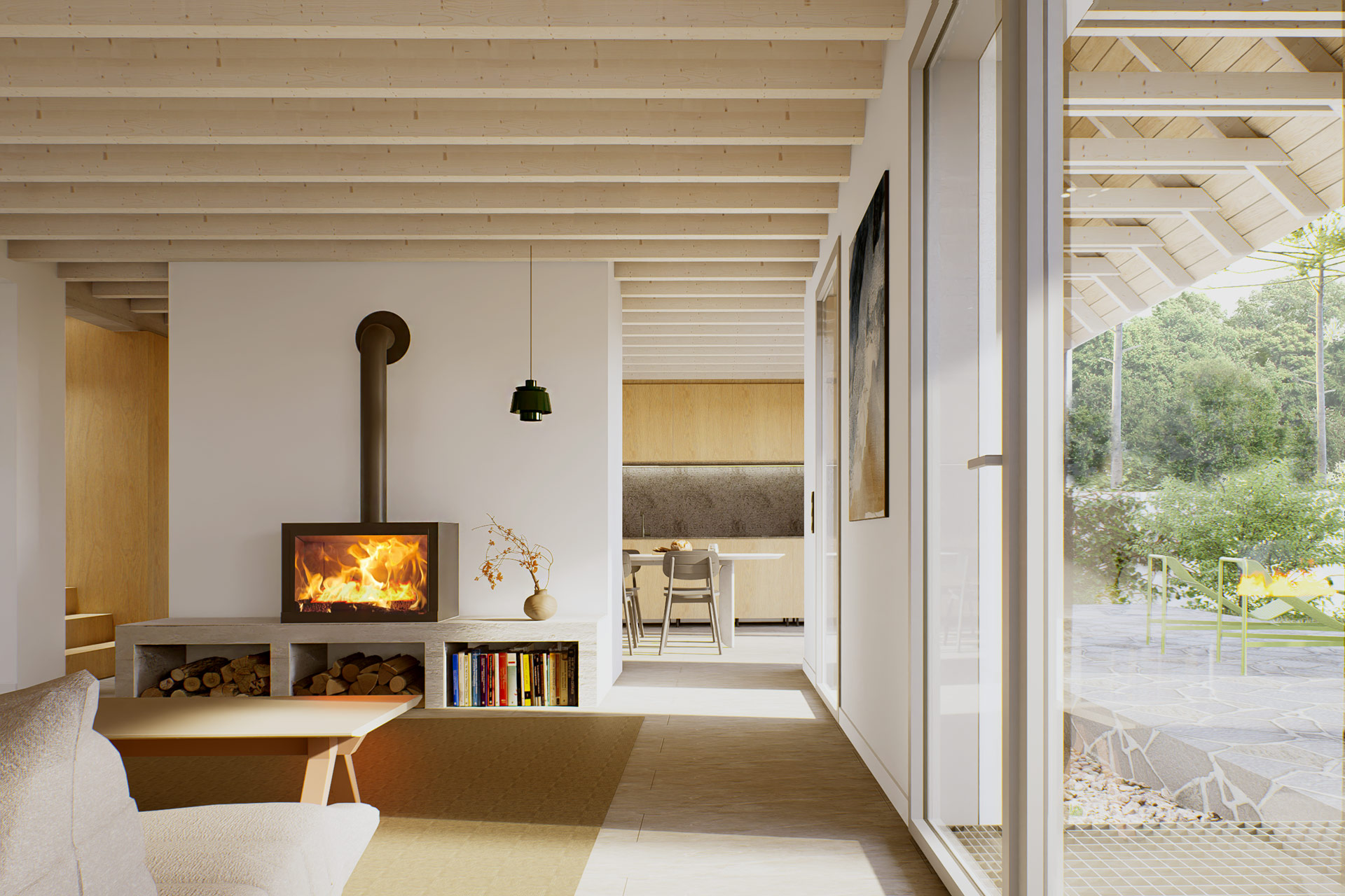 Le projet consiste en la construction d'une maison neuve dont le gabarit tout en longueur se glisse entre les pins. Coiffée d'une toiture à deux pans, les volumes de vie s'articulent autour d'un noyau dur d'espaces servants.